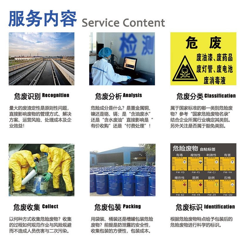 根据危险废物的危害性特点进行分类收集、包装、标识及暂存,并根据法律法规及地方环保主管部门的管理要求,与危险废物处置商签定危险废物处置合同、配合环保主管部门建立档案、并申报处理计划,在等环保主管部门审批回复后,填写危险废物转移联单执行安全转移废物处理。