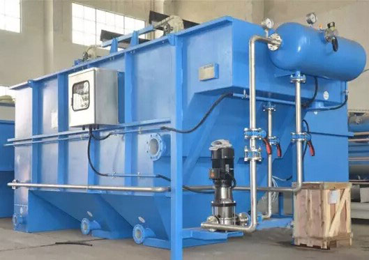 气浮设备也可称溶气气浮机主要是通过溶气系统和释放系统在水中产生大量的微细气泡,将废水中密度与水接近的固体或液体颗粒与水分离开来,达到固—液或液—液分离的目的。它既可以有效地去除废水中难以沉淀的细小悬浮物,也可以将溶于或半溶于水中液体分离开来,同时,结合相应的化学处理方法,能够有效确保水质达标排放。废水经絮凝反应后进入气浮区域,溶气泵将处理后的部分清水与空气吸入到溶气罐中,在一定压力的作用下,将大量的空气溶于水,形成溶气水。溶气水经过释放器,减压释放,产生大量直径为50um以下的微小气泡,微气泡在急速上升过程中,与污水中的悬浮物结合,使悬浮物浮上水面,形成浮渣。刮沫机则将浮渣、浮油清除,达到固液分离的目的。
